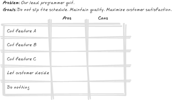 Comparative evaluation can happen only if you’ve clarified the problem or issue to be decided. You also need a sense for desirable outcomes (ship sooner, improve quality, make the VP happy, etc.). Borrow words and phrasing from the vision document, specifications, or requirements lists. Those documents reflect big decisions that have already been made, so use them as leverage. Sometimes a quick conversation with the client, customer, or author of those documents is better than the documents themselves.