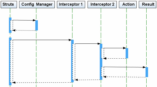 As mentioned earlier, there are a lot of things a filter dispatcher must do. Code that would otherwise reside in the filter dispatcher class is modularized into interceptors. The beauty of interceptors is they can be plugged in and out by editing the Struts’ configuration file. Struts achieves a high degree of modularity using this strategy. New code for action processing can be added without recompiling the main framework.